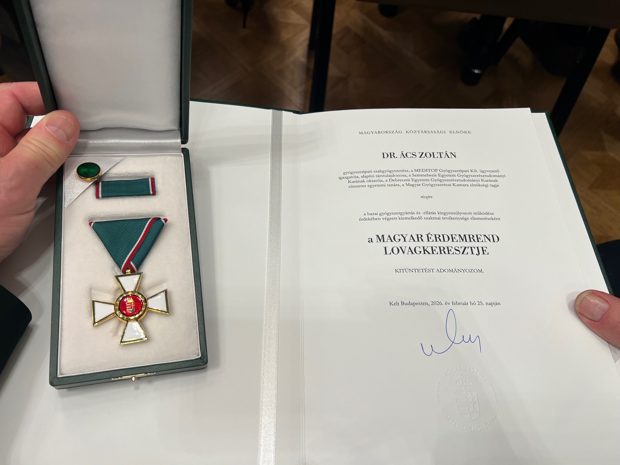 A MEDITOP Gyógyszeripari Kft. büszkén ad hírt arról, hogy Dr. Ács Zoltán, gyógyszeripari szakgyógyszerész, a MEDITOP Gyógyszeripari Kft. ügyvezető igazgatója és alapító társtulajdonosa, a Semmelweis Egyetem Gyógyszerésztudományi Karának oktató gyógyszerésze, a Debreceni Egyetem Gyógyszerésztudományi Kar címzetes egyetemi tanára, valamint a Magyar Gyógyszerészi Kamara elnökségi tagja rangos állami elismerésben részesült.
